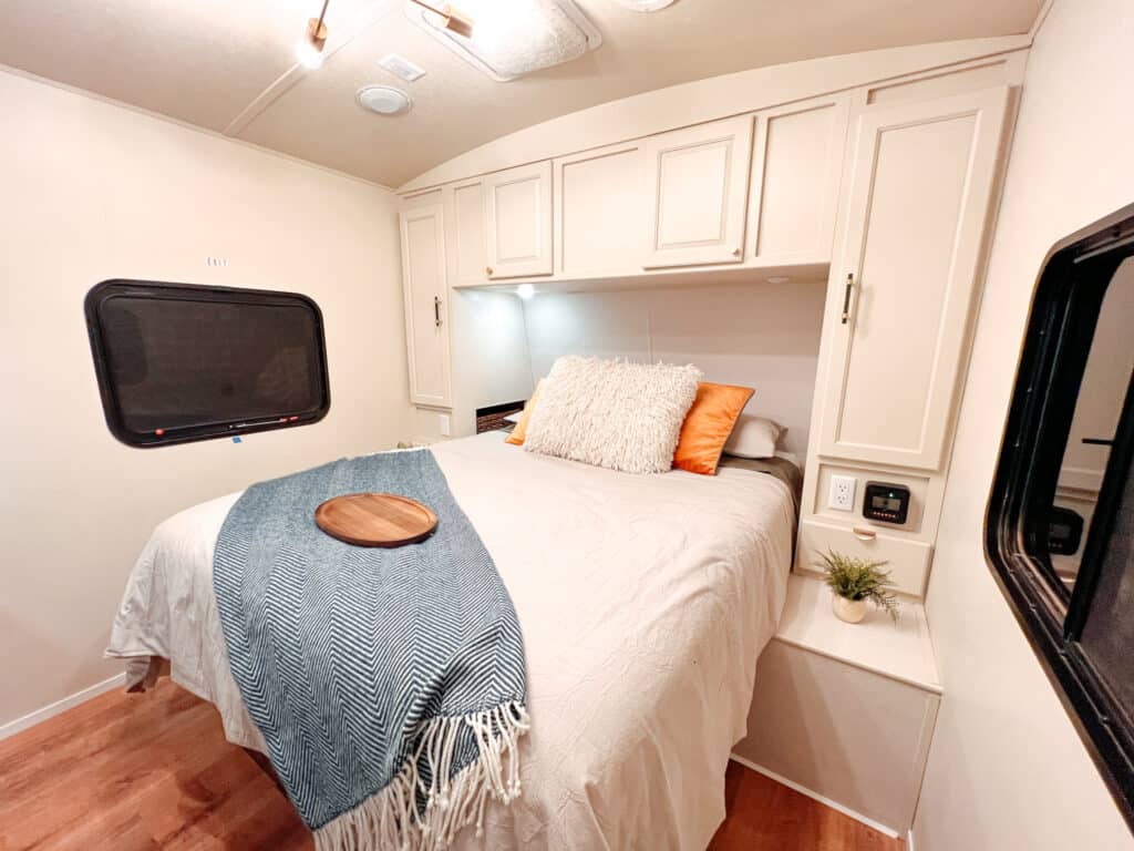 You can’t forget about durability when decorating your RV. Items that wobble, chip easily, or rely on delicate joints may not survive travel well. Thrift intentionally by choosing pieces that can be secured, stored easily, or serve more than one purpose (always a bonus!) Storage ottomans, nesting baskets, and trays that corral smaller items are all great examples.