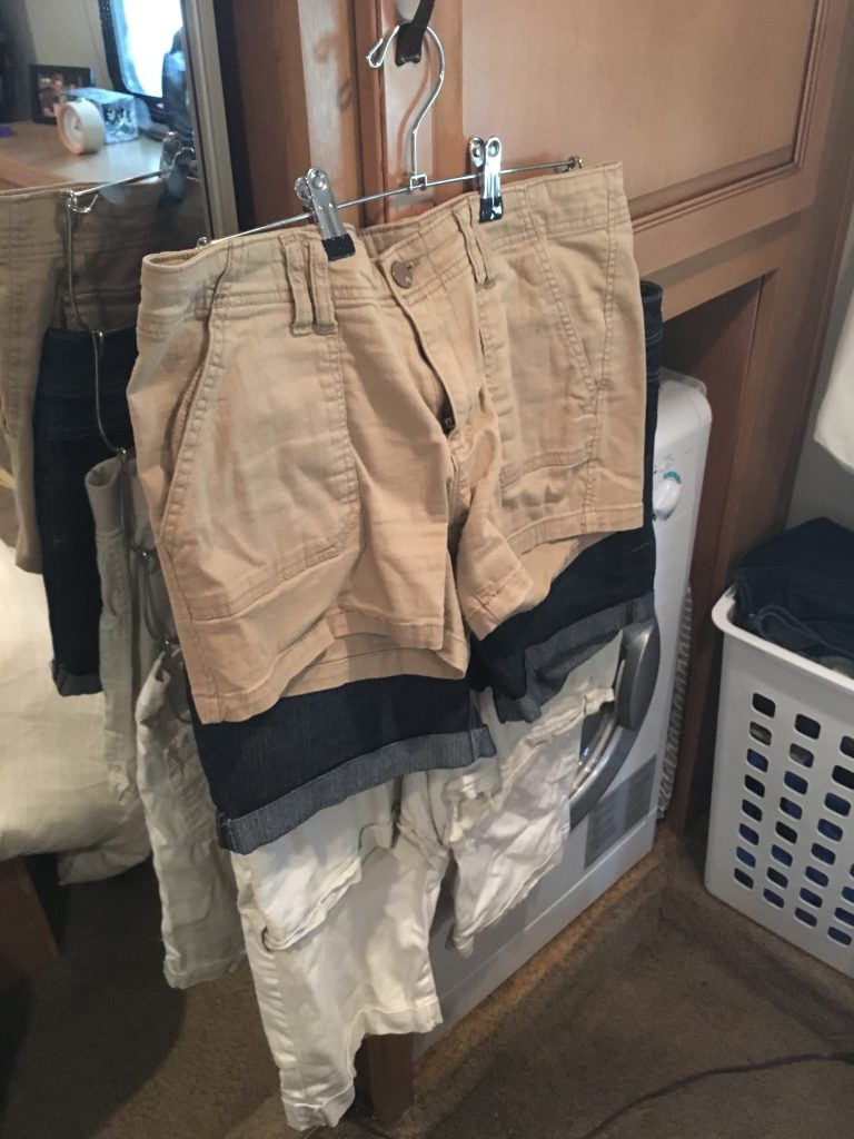 For shorts and skirts, I found these multi-level clip hangers at Walmart. They are on Amazon, too, for a fairly reasonable price.