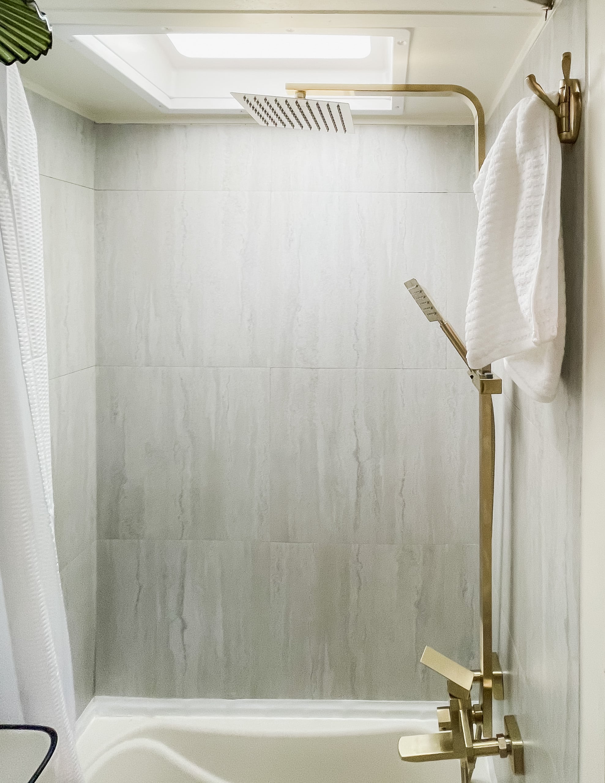 Brass and gold fixtures are popular this year and give your camper shower a luxurious vibe! Copy this look easily with a new showerhead from Amazon: